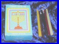 A box of 44 differently coloured Chanuka candles imported from Israel. Each candle has a spiral design and is 9mm at its base and 10cm tall. Colours included are red, blue, green, white, yellow and lilac.