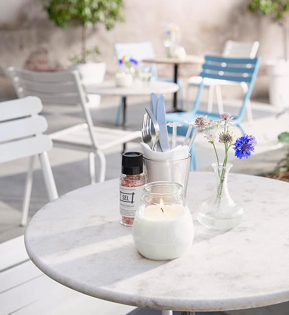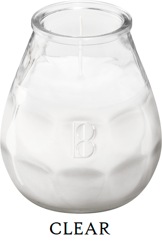 Filled unscented candle in a coloured glass jar available in Orange, Purple, Clear, White, Fuchsia, Amber, Metallic Green, Blue and Red