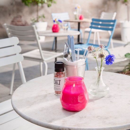 Filled candle in a coloured glass jar available in Orange, Purple, Clear, White, Fuchsia, Amber, Metallic Green, Blue and Red