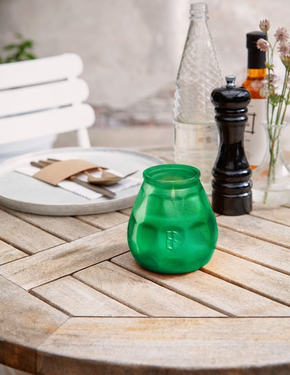 Filled candle in a coloured glass jar available in Orange, Purple, Clear, White, Fuchsia, Amber, Metallic Green, Blue and Red