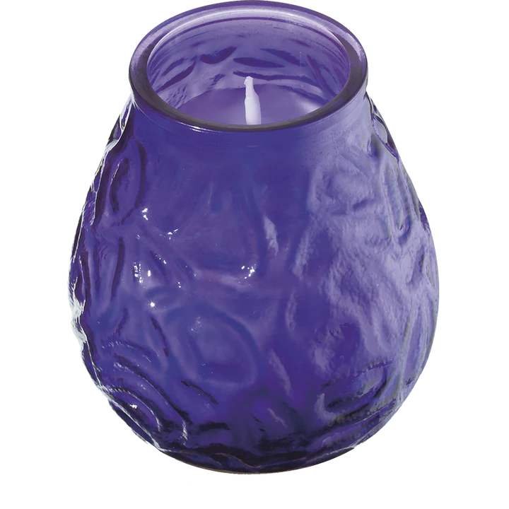Filled candle in a coloured glass jar available in Clear, White, Amber, Orange, Red, Purple.