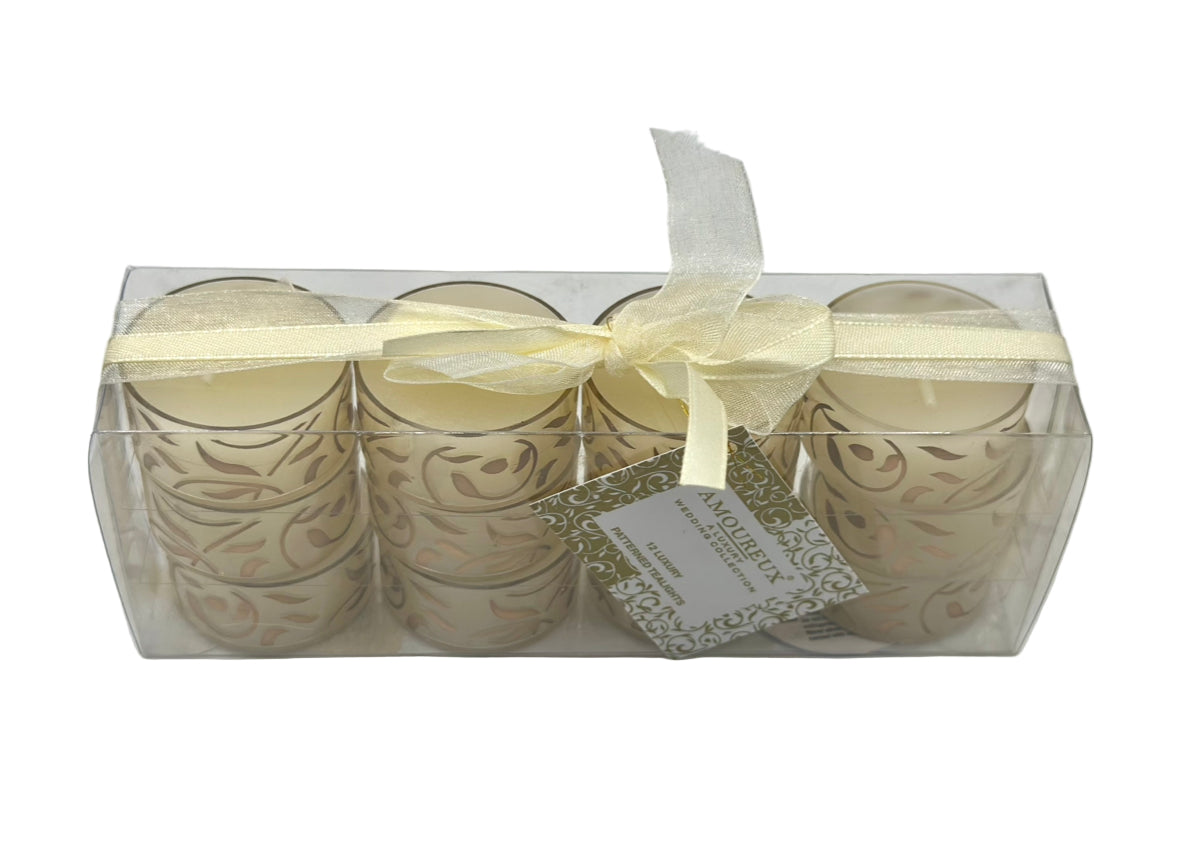 A set of 12 decorated T lights in a clear cup with a printed gold decoration. The colour in photo which shows the pack is more accurate than the individual picture which we have inserted to give you an idea of the pattern.